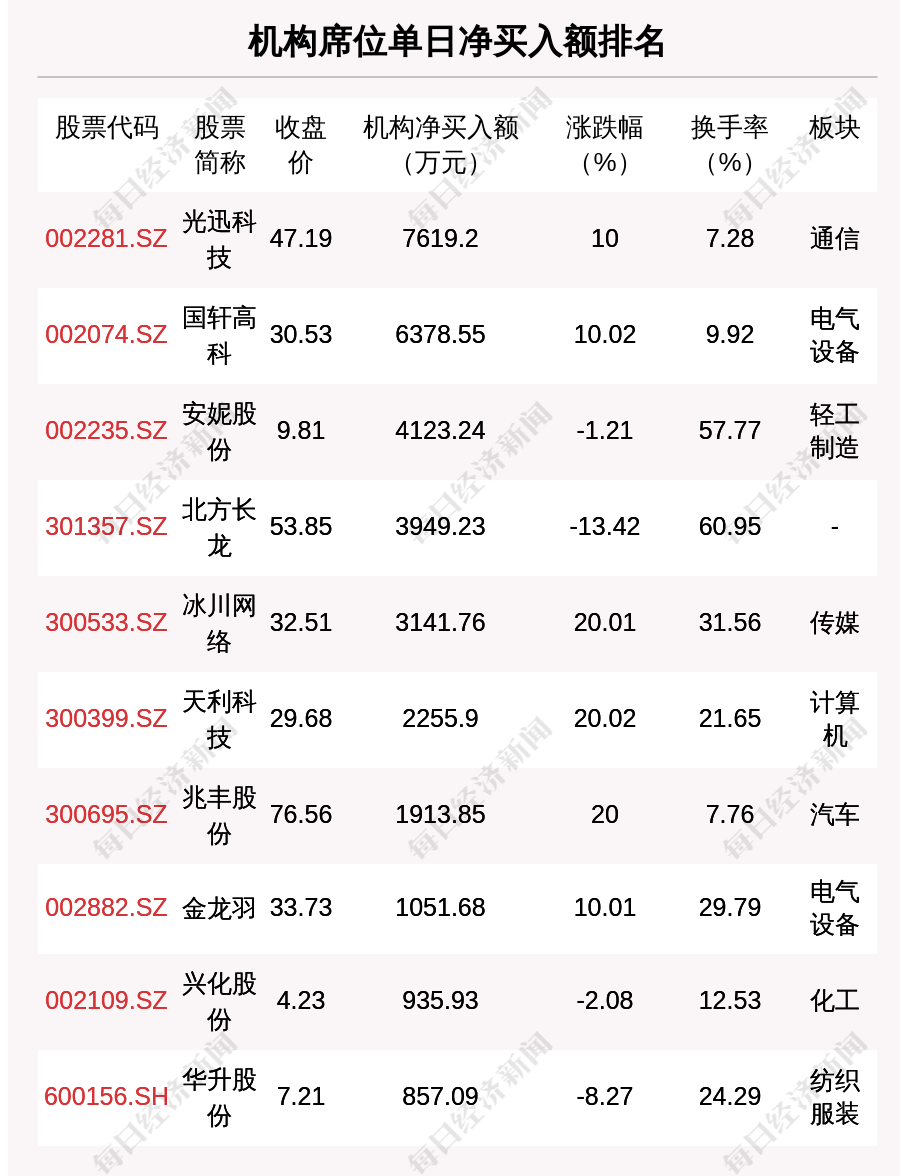 在龙虎榜中,涉及机构专用席位的个股有25只,净买入额前三的是光迅科技、国轩高科、安妮股份,分别为7619.2万元、6378.55万元、4123.24万元。
