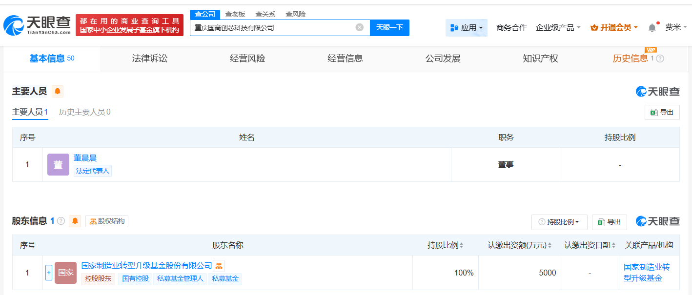 天眼查App显示,近日,重庆国高创芯科技有限公司成立,法定代表人为董晨晨,注册资本5000万人民币,经营范围包括软件开发、软件销售、先进电力电子装置销售、互联网数据服务、人工智能公共服务平台技术咨询服务、云计算设备销售等,由国家制造业转型升级基金股份有限公司全资持股。