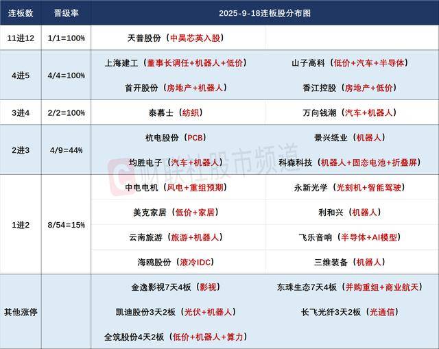 财联社9月18日讯,今日55股涨停,62股炸板,封板率为47%,天普股份12连板,首开股份12天11板,上海建工、香江控股、山子高科5连板,万向钱潮、泰慕士4连板,景兴纸业、均胜电子、科森科技、杭电股份3连板,北交所三维装备30cm2连板,利和兴20cm2连板,东珠生态、金逸影视7天4板。三大指数冲高快速回落。沪深两市成交额3.135万亿,较上一个交易日放量7584亿,创年内第三。盘面上个股普跌,全市场超4300只个股下跌。板块方面,旅游、CPO、芯片产业链等板块涨幅居前,多数板块下跌,有色金属、大金融、稀土永磁等板块跌幅居前。截至收盘,沪指跌1.15%,深成指跌1.06%,创业板指跌1.64%。