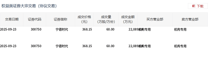 9月23日,宁德时代大宗交易成交120万股,成交额4.42亿元,占当日总成交额的3.33%,成交价368.15元,较市场收盘价368.15元持平。