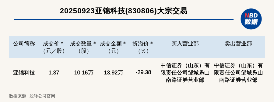 每经讯,2025年9月23日,新三板创新层公司亚锦科技(830806,收盘价:1.94元)发生一笔大宗交易,成交价1.37元/股,成交数量10.16万股,成交金额13.92万元,折价29.38%。买入营业部是中信证券(山东)有限责任公司邹城凫山南路证券营业部,卖出营业部是中信证券(山东)有限责任公司邹城凫山南路证券营业部。