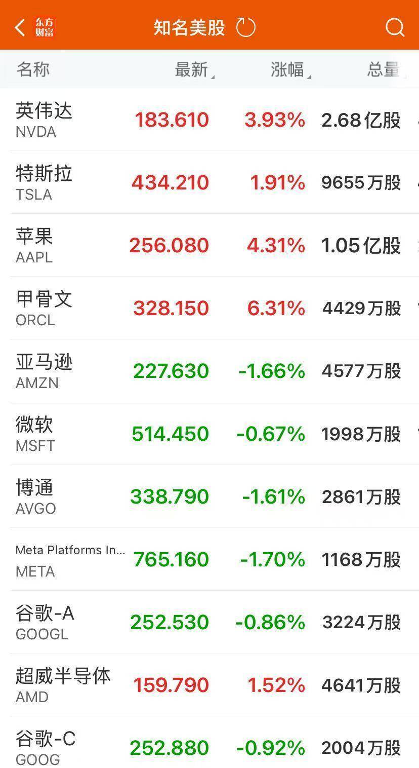 大型科技股多数上涨,甲骨文涨超6%,苹果涨超4%,台积电涨近3%(刷新纪录高位),亚马逊、Meta、博通跌超1%。