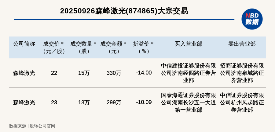 每经讯,2025年9月26日,新三板创新层公司森峰激光(874865,收盘价:25.58元)发生2笔大宗交易,总成交金额为629万元,成交金额最高的一笔成交价22元/股,成交数量15万股,成交金额330万元,折价14%。买入营业部是中信建投证券股份有限公司济南经四路证券营业部,卖出营业部是招商证券股份有限公司济南泉城路证券营业部。