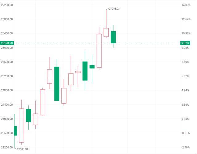 若从全周来看,恒生指数呈现震荡走势。该指数在周初因市场对美联储降息预期消化及内地经济数据疲软影响,一度触及周内低点26003.67点,但随后受科技股和周期股带动逐步回升。今日指数再度回落,直至收于26100点上方。