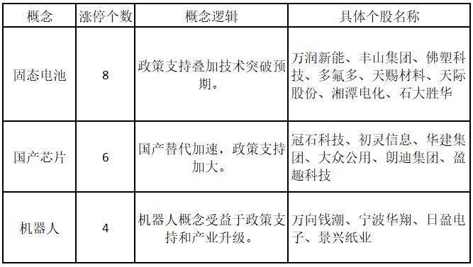 从概念特征来看,今日涨停板个股中,固态电池、国产芯片、机器人概念的个股最多。