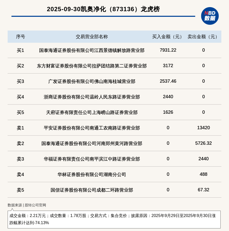 每经讯,2025年9月30日,新三板创新层公司凯奥净化(873136,收盘价:1.26元)登上龙虎榜,交易方式是集合竞价,披露原因是2025年9月29日至2025年9月30日涨跌幅累计达到-74.13%,成交数量1.78万股,成交金额2.21万元。买一席位为国泰海通证券股份有限公司江西景德镇解放路营业部,买入7931.22元;卖一席位为平安证券股份有限公司南通工农南路证券营业部,卖出1.34万元。