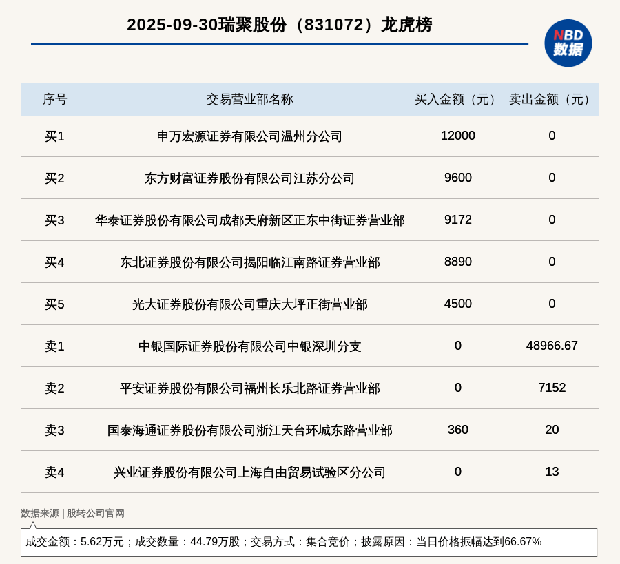 每经讯,2025年9月30日,新三板基础层公司瑞聚股份(831072,收盘价:0.2元)登上龙虎榜,交易方式是集合竞价,披露原因是当日价格振幅达到66.67%,成交数量44.79万股,成交金额5.62万元。买一席位为申万宏源证券有限公司温州分公司,买入1.2万元;卖一席位为中银国际证券股份有限公司中银深圳分支,卖出4.9万元。