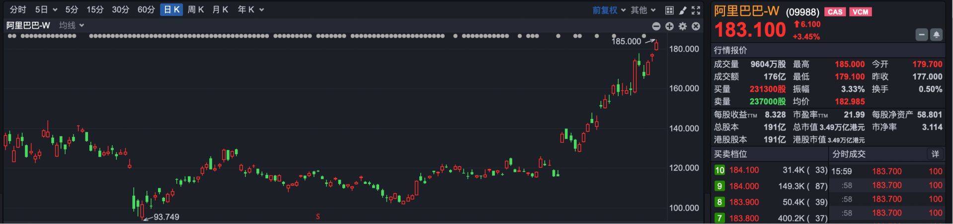 消息面,摩根大通将阿里巴巴港股目标价大幅上调至240港元,称云计算和电商业务的增长料支撑其更高估值。如果以今日收盘价计算,按照摩根大通给出的目标价,阿里巴巴未来还有超30%的上涨空间。