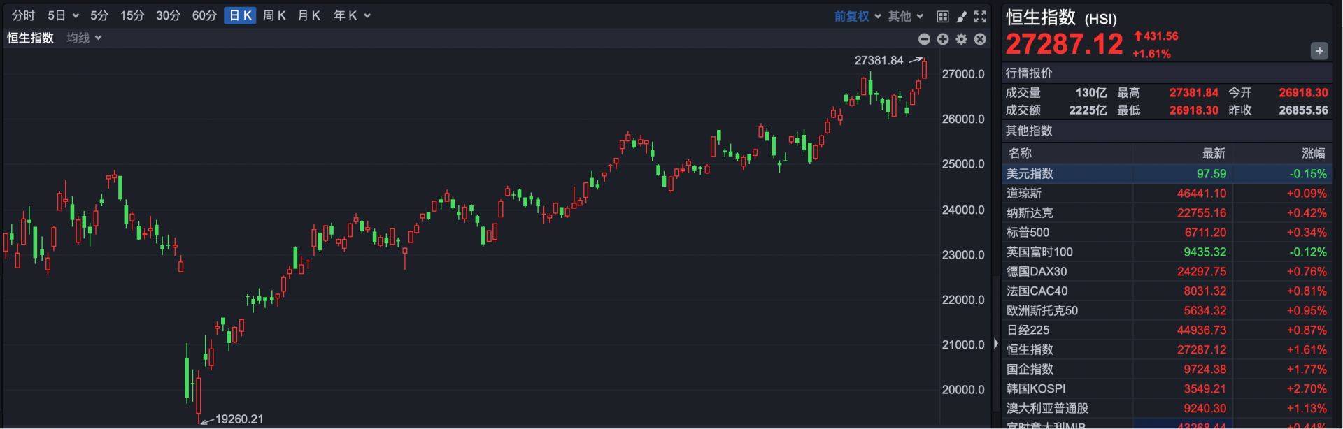 截至收盘,恒生指数报收于27287.12点,上涨431.56点,涨幅1.61%。