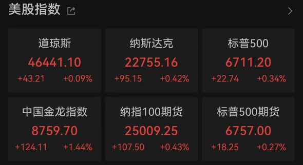 美东时间10月1日周三,美国三大股指小幅收涨。其中,道指涨0.09%报46441.1点,纳指涨0.42%报22755.16点,标普500指数涨0.34%报6711.2点,突破6700点大关,收盘创下历史新高。